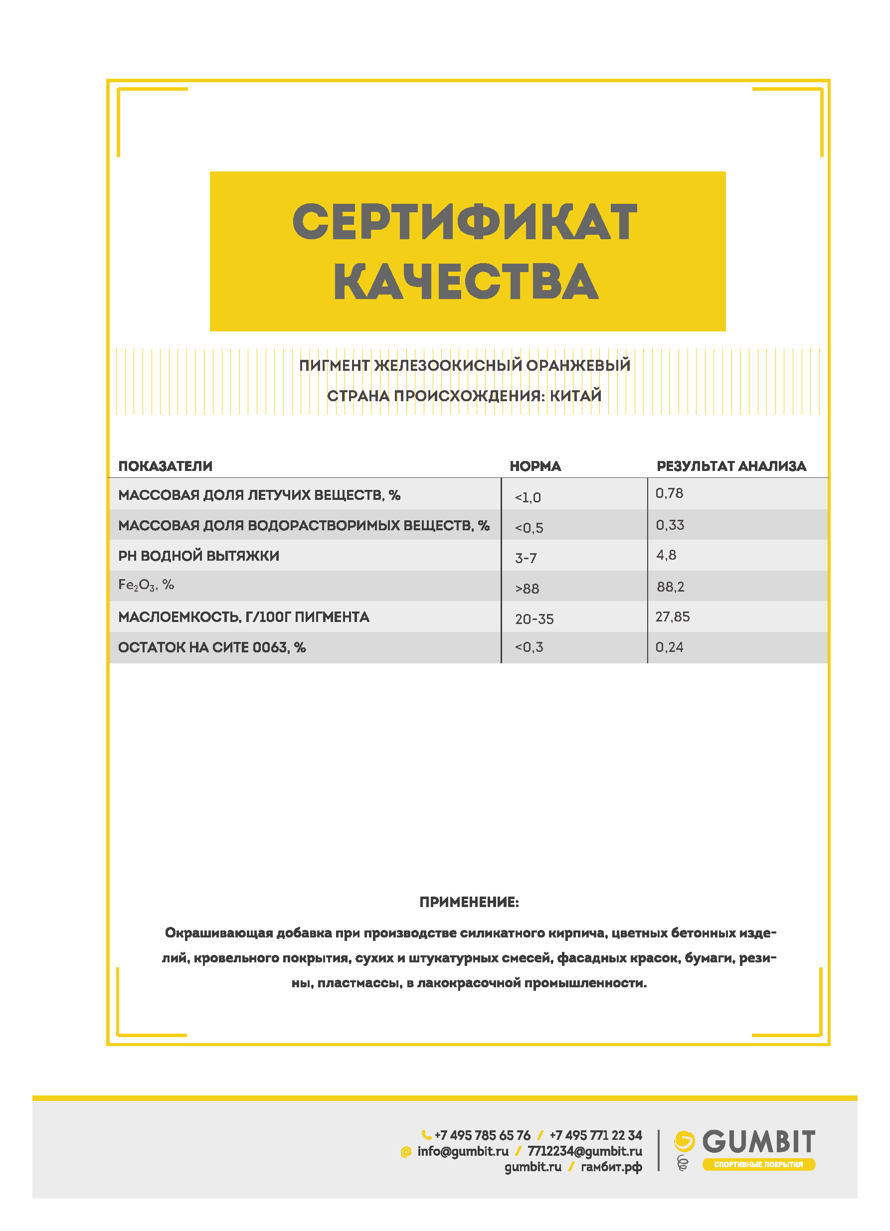 Данный пигмент используется для стабилизации цвета и увеличения светостойкости синего пигмента в резиновых покрытиях. Также данный пигмент может использоваться для расширения цветовой гаммы покрытий